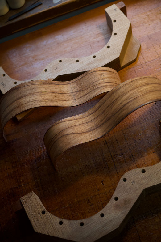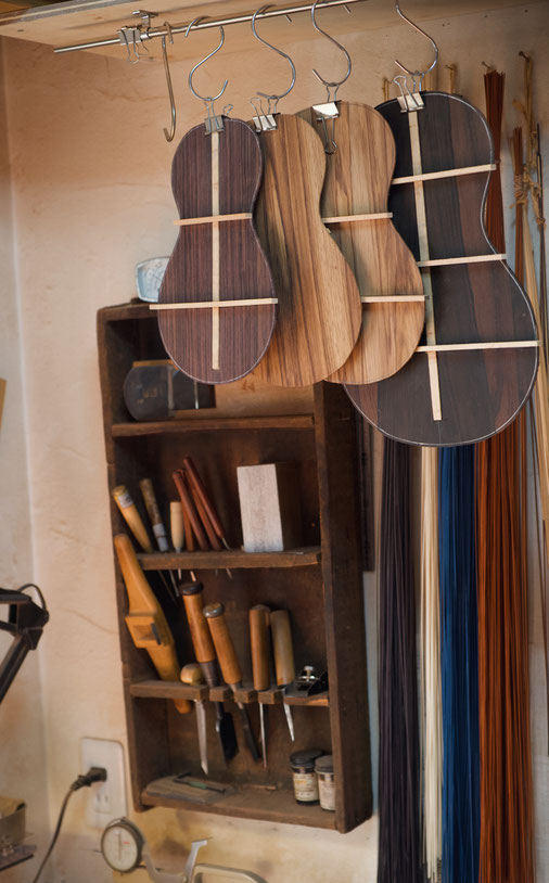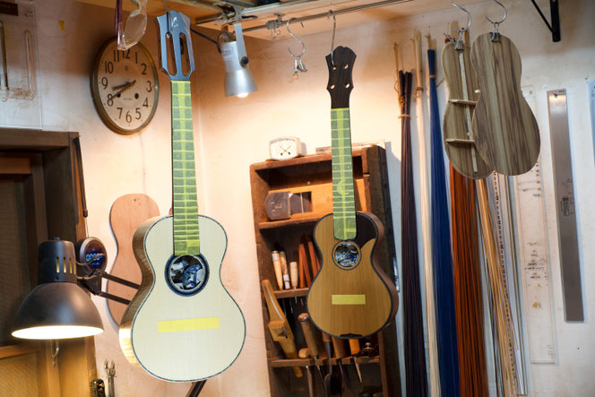 時間かけて天候に逆らわずにじっくり塗膜を作り上げていくのが好きなんです。塗装が停滞したとしても次のロットの木工を進めていれば結果的に全体として作業は進んでいることに変わりないので焦る必要もないと思うようになりました。二液混合タイプの一瞬で分厚く吹ける塗装で終わらせてしまうやり方もあるけどそれは性に合わないのでやらない。あくまでラッカーオンリー。手間かかるけど断然音抜けがいい。