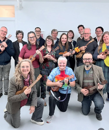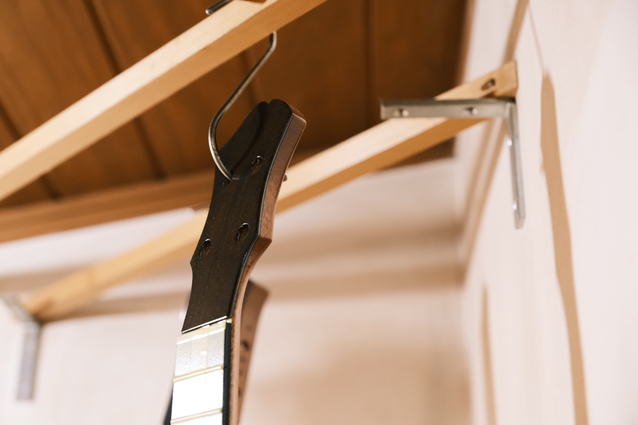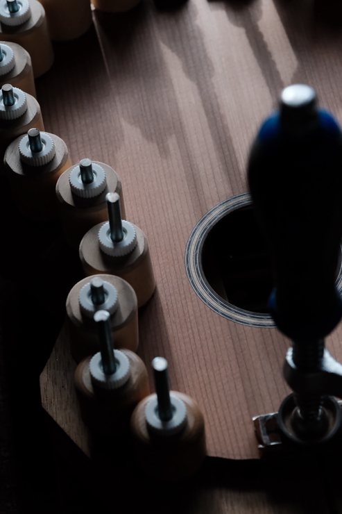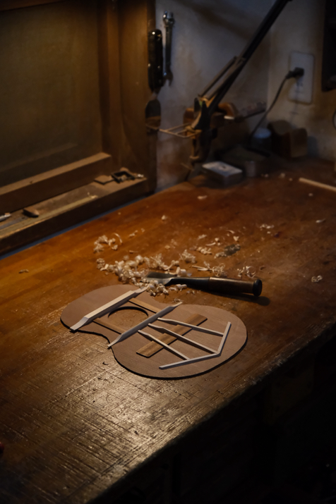 塗装が早く切り上がり並行していた木工作業に本腰を入れることができました。有難い。ゴーバーでテナー表板のブレイシングを一気に接着しているところです。